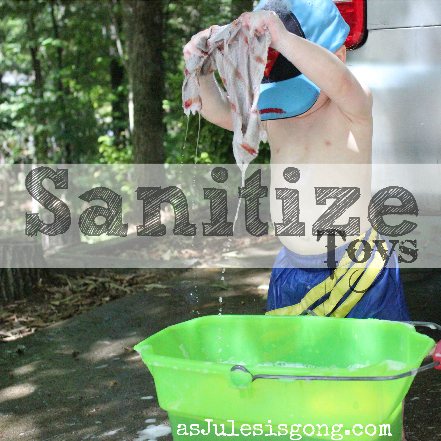 {containing no tiny holes where water can seep in and STAY}Begin running warm-scalding hot water into your bathtub mixing in about 1 cup of bleach. Sometimes I don't have pure bleach so I use some sort of cleaning spray I have that contains bleach or claims to kill lots of germs. Then fill you tube with all your plastic toys. Cover all your toys with water...unless you put giant stuff in there. Then you might want to let the little stuff soak and then rinse the larger items by dumping your water/bleach mixture over them. Let your toys soak for at least 30 minutes to 1 hour. I've totally been known to forget toys or run out of time and leave them over night. After they've soaked, drain the water/bleach mixture and then rinse the toys with plain water. The hotter the water the better. Lay out on a towel or occasionally giggle them around int the tube making sure there is no standing water and let them air dry. I do this every few months or more often during cold/flu season or if we had tons of kids over for a party.